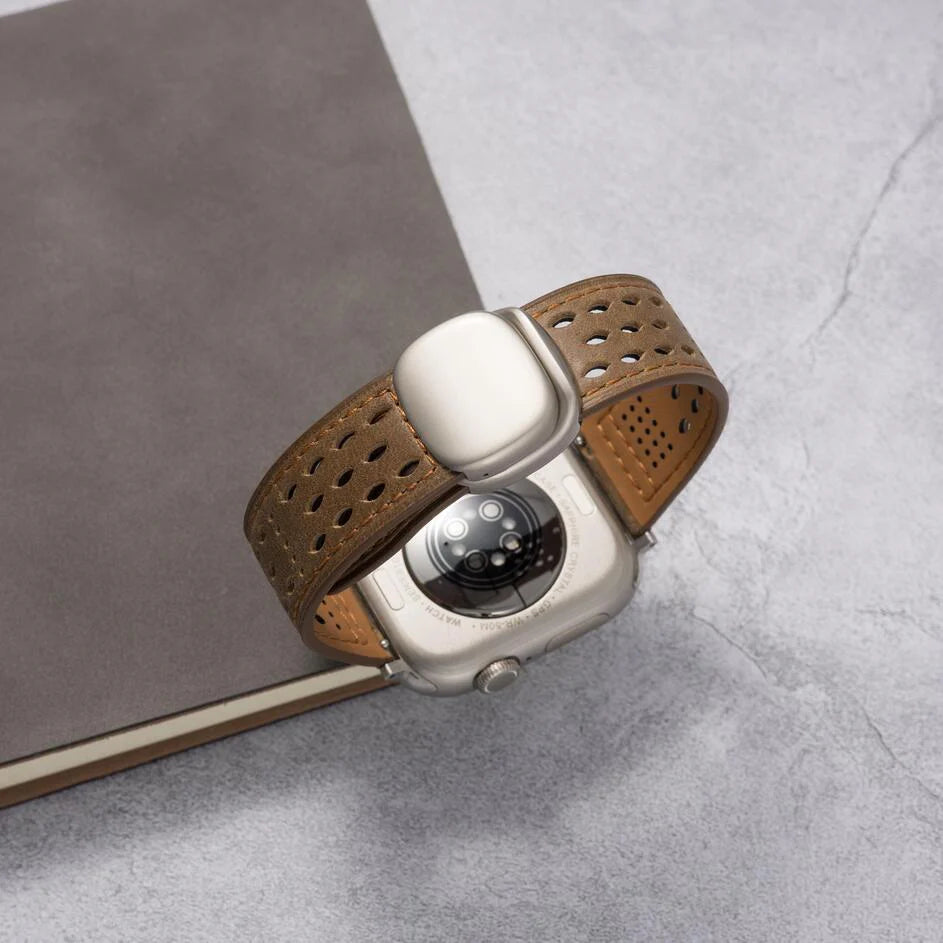 Esta correa de cuero perforado transpirable para Apple Watch combina una artesanía de primera calidad con un diseño funcional. Las perforaciones mejoran la ventilación, reduciendo el sudor y mejorando la comodidad durante el uso prolongado.